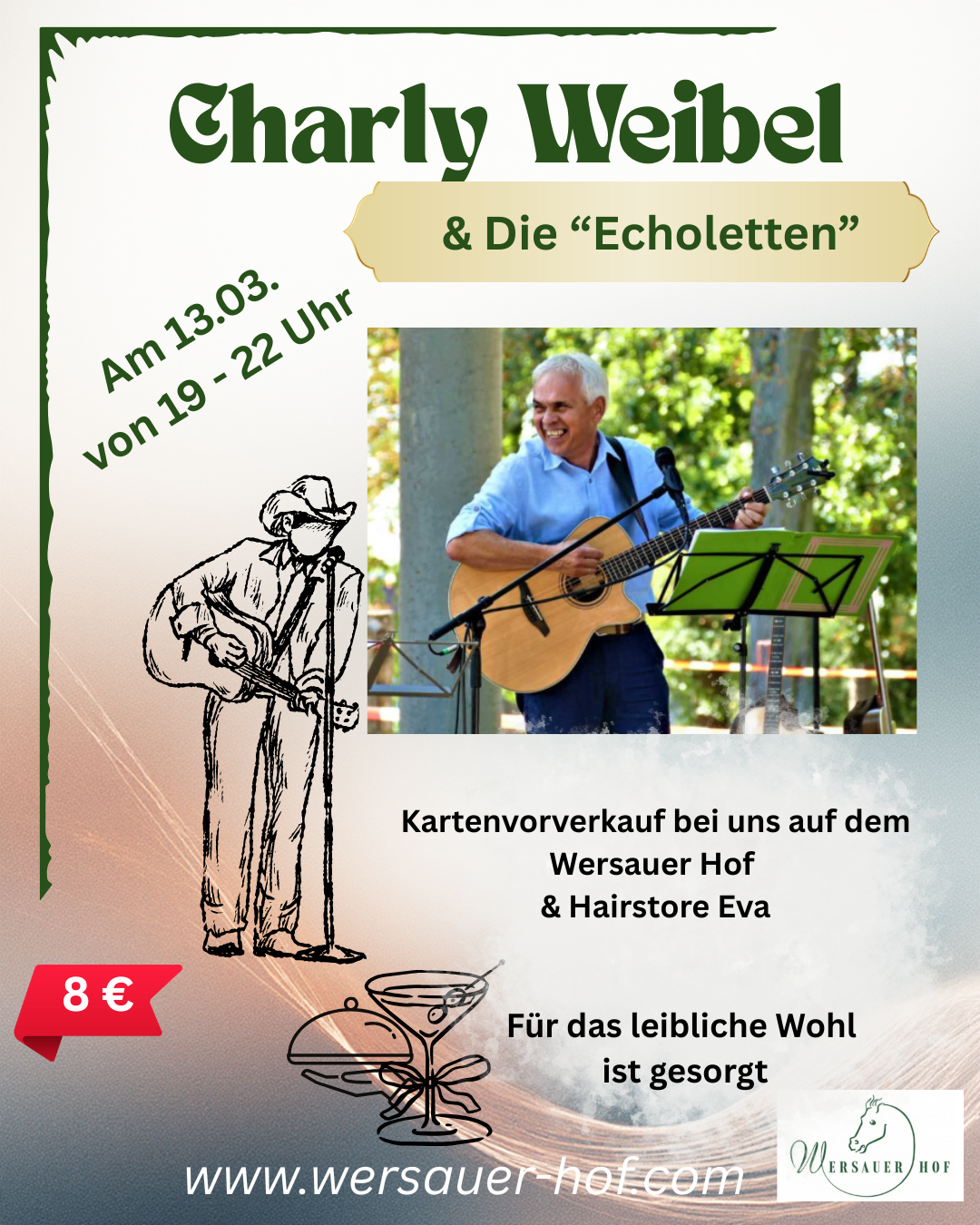 Der Eintritt beträgt 8,00 € im Kartenvorverkauf. Tickets erhaltet ihr direkt bei uns im Wersauer Hof, bei Charley Weibel selbst sowie bei Hairstore Eva.