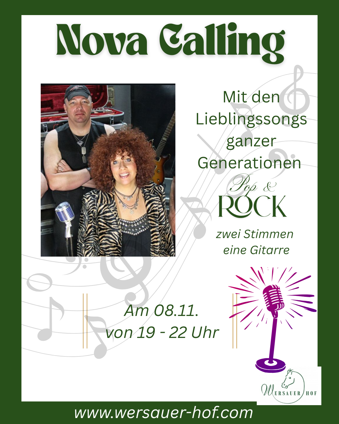 Die Sängerin und der Gitarrist von Red Ordinary sind jetzt als Duo unterwegs – unter dem Namen Nova Calling. Mit ihrer energiegeladenen Performance, viel Gefühl und einem Mix aus Rock und Pop sorgen sie für ausgelassene Stimmung und echte Gänsehautmomente.