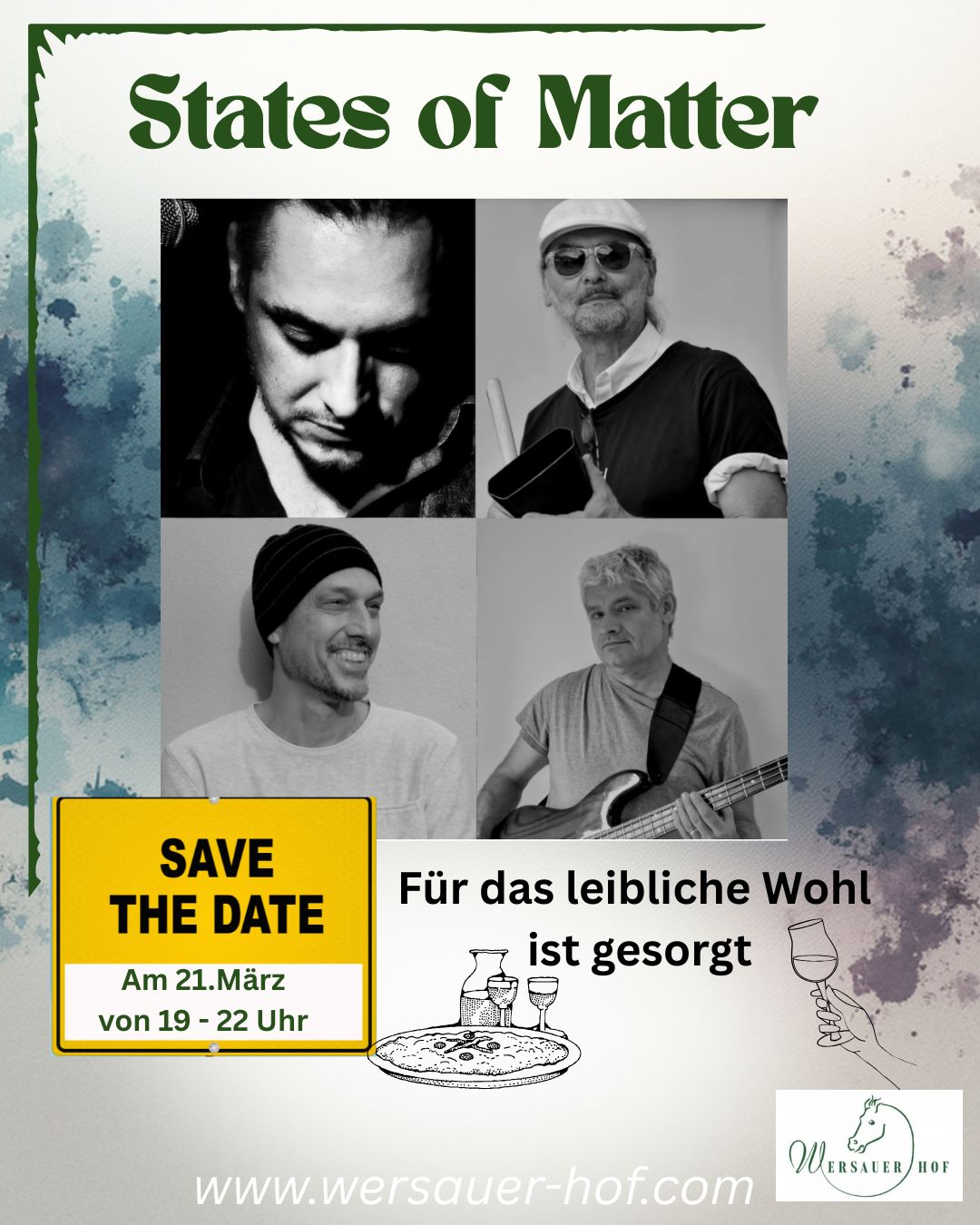 Am 21.03. dürfen wir auf dem Wersauer Hof die Band States of Matter begrüßen. Die Band steht für einen vielseitigen Sound aus Alternative Rock, Westcoast-Vibes und groovigen Rhythmen und begeistert mit energiegeladenen Live-Auftritten und viel Spielfreude.