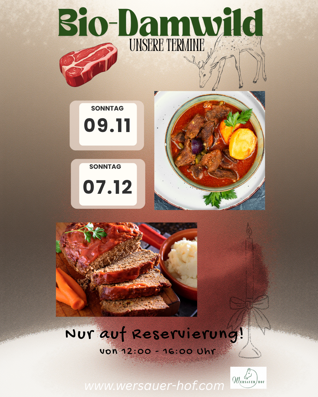 Bio-Damwild Genuss! Dieses Jahr findet wieder unser beliebtes Bio-Damwild-Essen statt! Serviert wird: Zartes Fleisch in regionaler Qualität mit herbstlichen Beilagen. Ein Tag für Genießer. Am 09.11 und 07.12 von 12:00 – 16:00 Uhr Reservierung